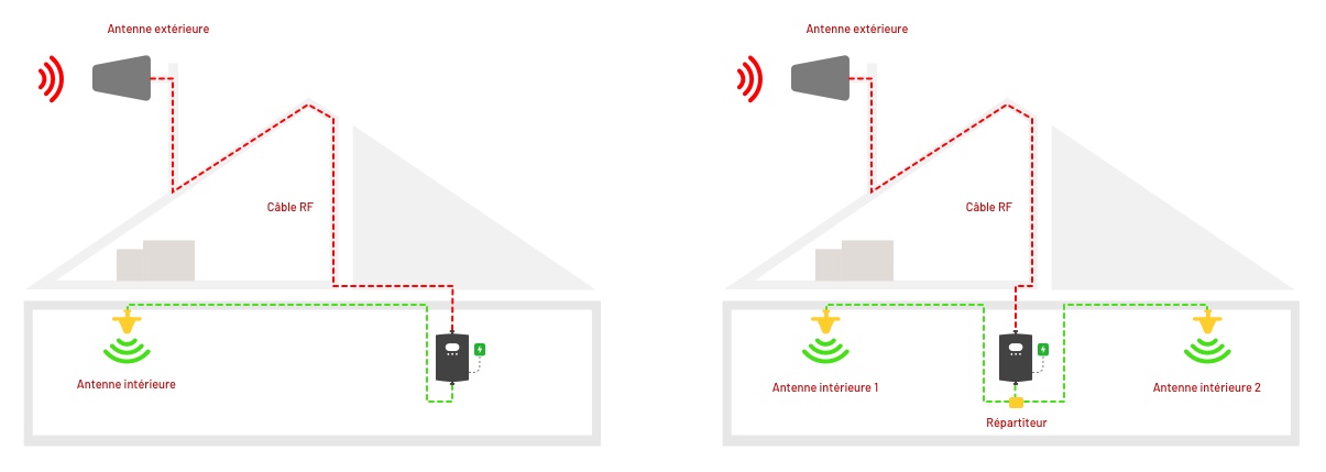 Pour améliorer la couverture intérieure, vous pouvez essayer de régler la position des antennes de manière à ce qu'elles ne fassent face à aucun obstacle physique. Si, après avoir fait cela, la couverture reste insuffisante, vous pouvez ajouter une autre antenne intérieure, qui sera connectée à l'unité principale avec un diviseur. Consultez notre page accessoires pour tout le matériel nécessaire pour améliorer votre configuration de booster de signal.